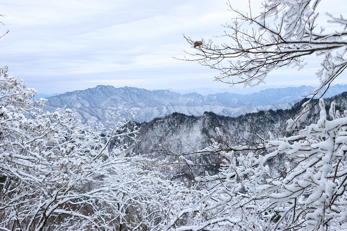 西峡县老界岭山区迎来初雪,天地步入银装素裹的磅礴诗篇。群峰如银龙匍匐,万木似玉珊瑚绽放,纷扬的大雪将嶙峋怪石、亭台石阶点染成水墨画卷。(西峡县纪委监委供 杨永青 摄)