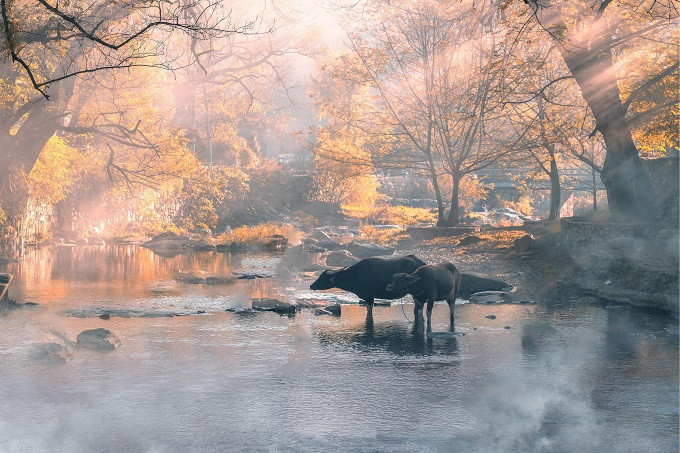 冬日的晨雾轻笼溪涧,水牛静立水中,与金黄树影晕染成画。柔光穿雾而来,给寒水镀上暖芒,光秃的枝桠在清寒里伸展,酿成一帧诗意的乡野留白。(新密市纪委监委 朱留波 摄)