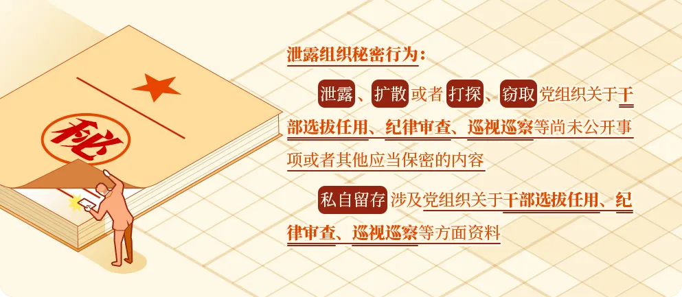 《中国共产党纪律处分条例》第一百四十四条对泄露组织秘密行为作出了处分规定。泄露、扩散或者打探、窃取党组织关于干部选拔任用、纪律审查、巡视巡察等尚未公开事项或者其他应当保密的内容的,给予警告或者严重警告处分;情节较重的,给予撤销党内职务或者留党察看处分;情节严重的,给予开除党籍处分。私自留存涉及党组织关于干部选拔任用、纪律审查、巡视巡察等方面资料,情节较重的,给予警告或者严重警告处分;情节严重的,给予撤销党内职务处分。