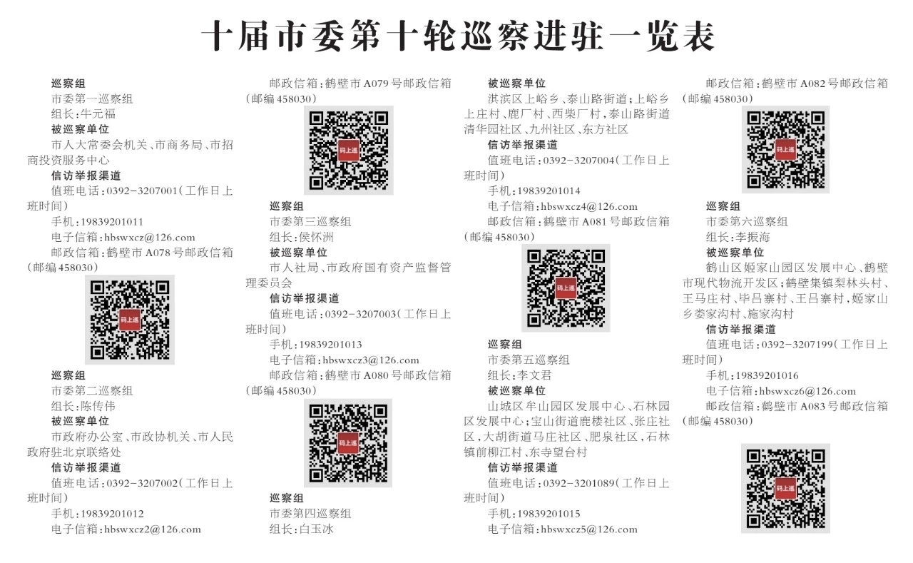 根据市委统一部署,截至10月16日,十届市委第十轮巡察完成进驻工作。6个市委巡察组分别对8家单位党组织开展常规巡察,对淇滨区、山城区、鹤山区所辖的2个乡镇(街道)、4个园区及18个村(社区)党组织开展提级巡察。