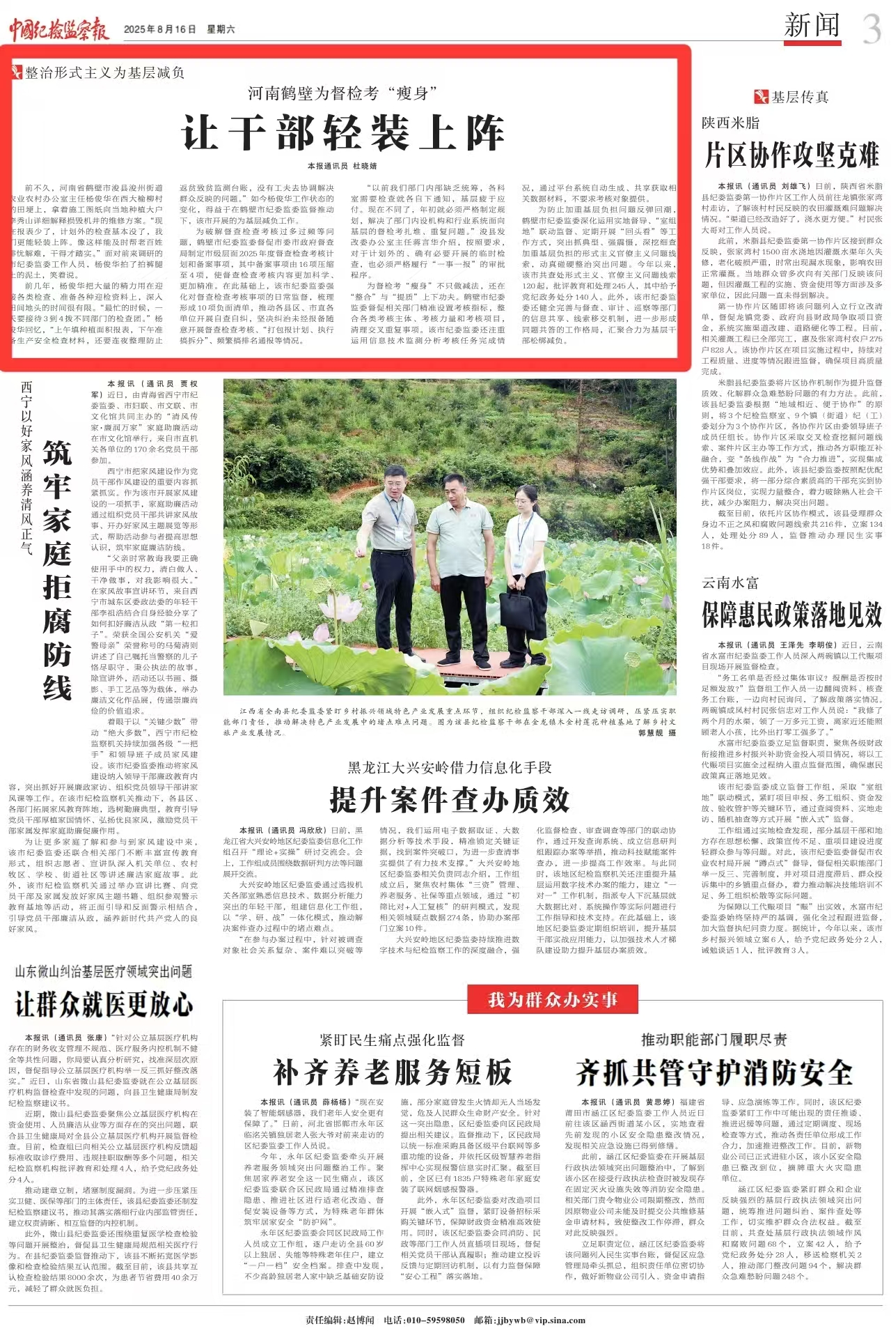 前不久,河南省鹤壁市浚县浚州街道农业农村办公室主任杨俊华在西大榆柳村的田埂上,拿着施工图纸向当地种植大户李秀山详细解释损毁机井的维修方案。“现在报表少了,计划外的检查基本没了,我们更能轻装上阵。像这样能及时帮老百姓排忧解难,干得才踏实。”面对前来调研的市纪委监委工作人员,杨俊华拍了拍裤腿上的泥土,笑着说。