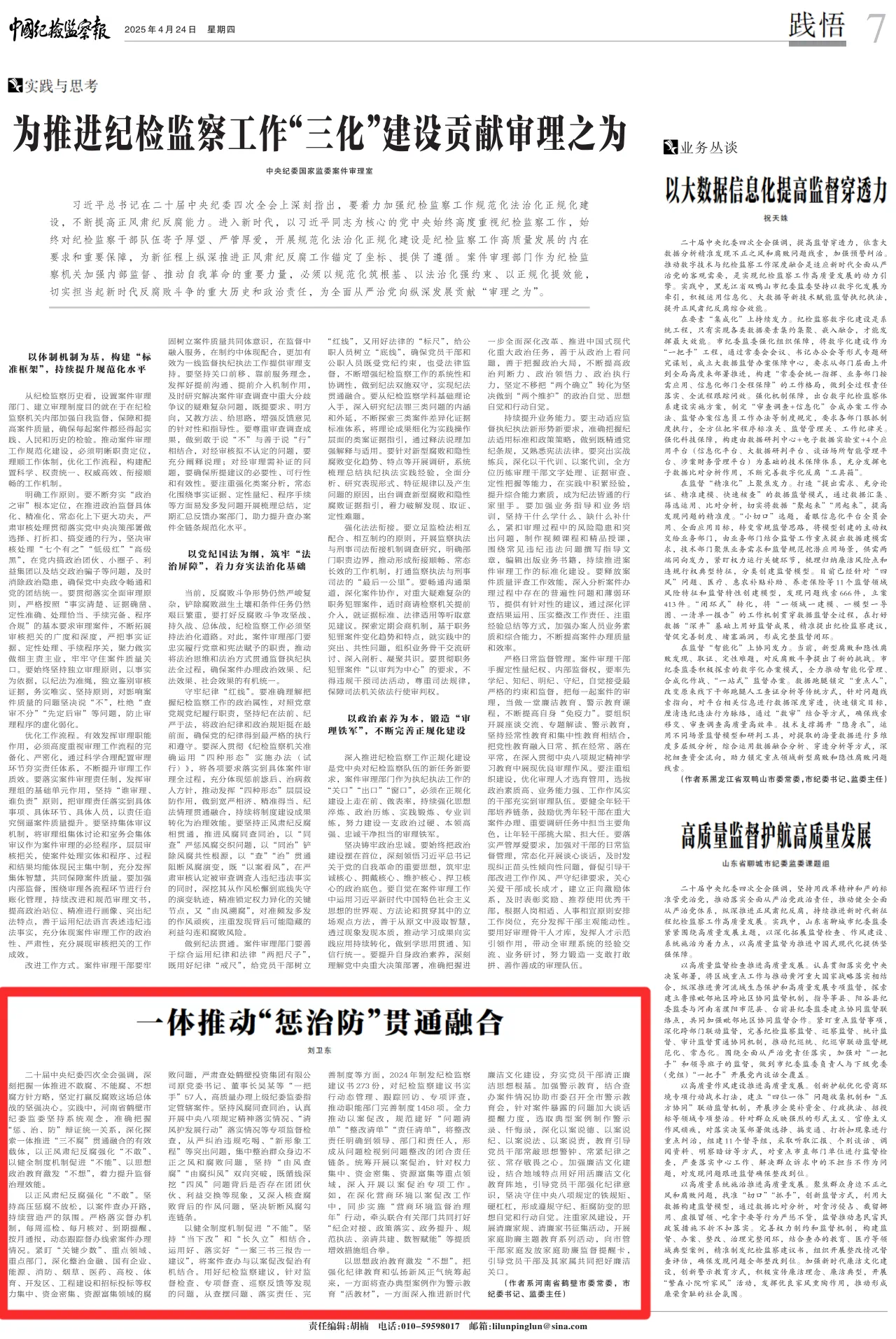 2025年4月24日《中国纪检监察报》刊发河南省鹤壁市委常委,市纪委书记、监委主任刘卫东署名文章《一体推动“惩治防”贯通融合》。
