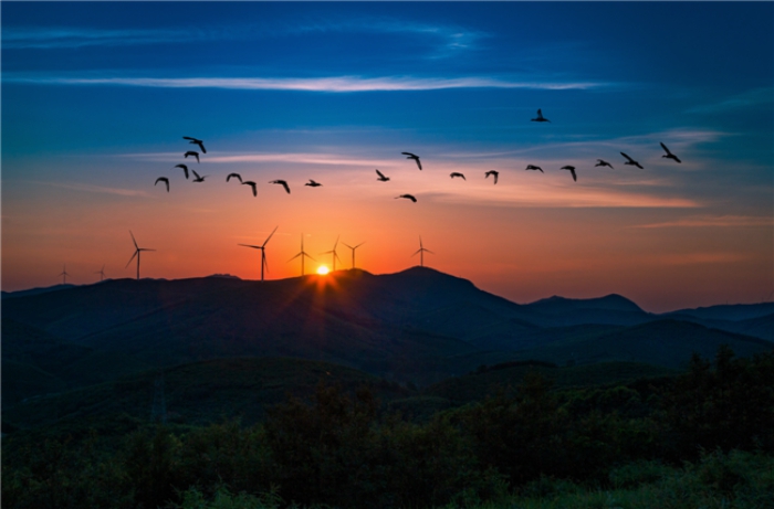 深秋的脚步近了,迎着冉冉朝阳,南飞雁在晨曦中展翅翱翔,一派生机与希望。