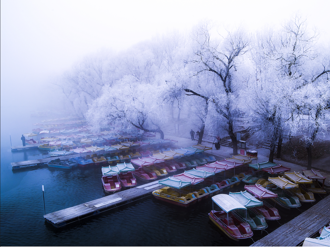 游船靠岸待冰封,老枝凝霜露冬颜。大雪时节,清晨空气冷冽,薄雾萦绕,淇河畔游船靠岸停泊,静待冰封河面,岸边树木霜染枝头,凛然傲对冬之寒。