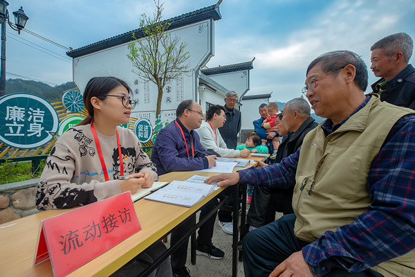 图为4月7日,浙江省淳安县临岐镇纪检监察干部在仰韩村廉政文化公园开展流动接访,收集群众身边的腐败和不正之风问题线索。毛勇锋 摄