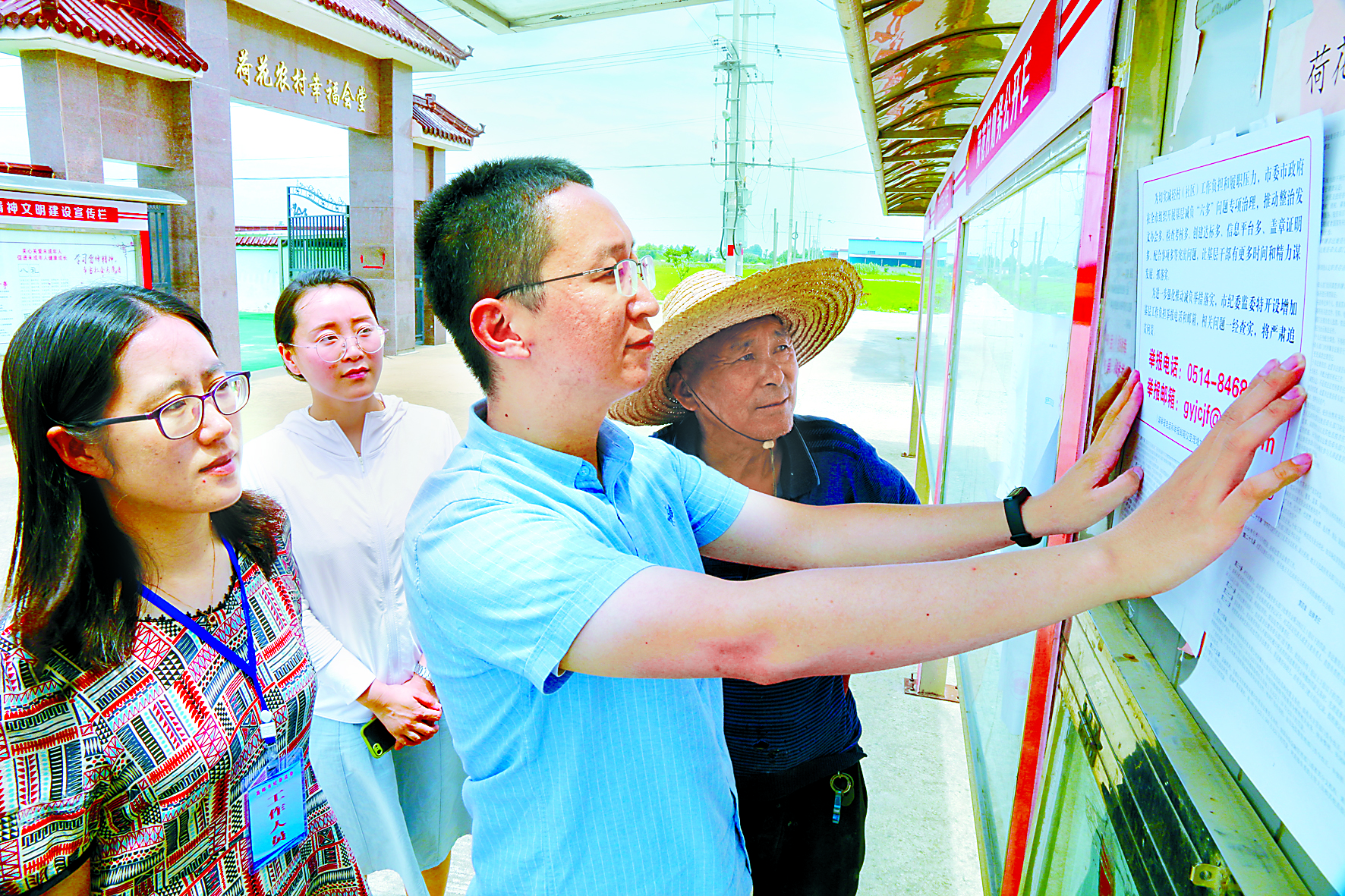 江苏省高邮市纪委监委针对基层发文办会多、创建达标多、盖章证明多等问题开展基层减负专项治理,让基层干部有更多的时间和精力谋发展、抓落实。图为该市纪检监察干部在甘垛镇荷花村张贴增加基层工作负担举报电话和邮箱。谭倩 摄
