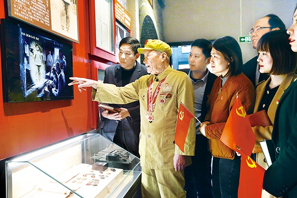 图为江苏省宜兴市纪检监察干部参观党史陈列馆,聆听有65年党龄的老党员讲述抗战经历。邹宜宾 摄