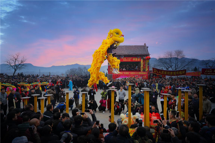 每逢元宵佳节,鹤壁古庙会盛典上都会以舞狮助兴,舞狮表演时而威武勇猛,雄壮威风,时而嬉戏欢乐,幽默诙谐,精彩的表演让游客感受到了舞狮子闹新春的喜庆与热闹。
