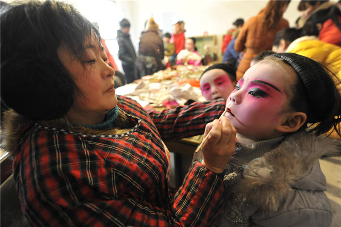 参加背阁社火表演的孩子们早早起床化妆,白色打底,红色敷脸,黑色描眉画眼,再穿上各自扮演角色的戏服,准备精彩亮相,上演“肩上芭蕾”。