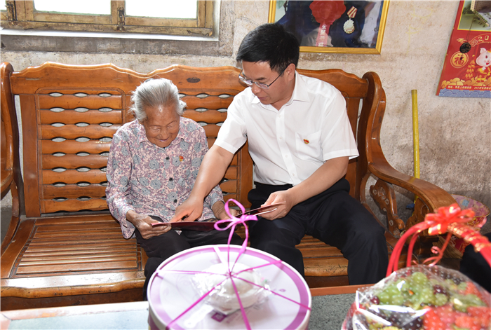 “七一”前夕,淇县县委书记王海涛看望96岁的老党员、全国劳动模范----靳月英,为她送上生日蛋糕、佩戴党员徽章,号召全县党员干部学习劳模精神,传承优良传统。