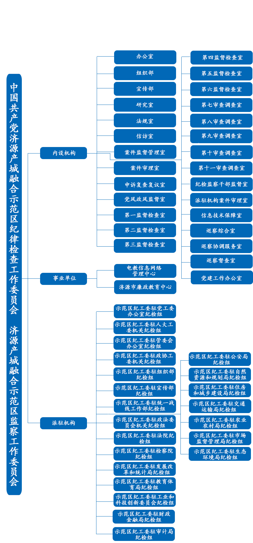 中共济源产城融合示范区纪律检查工作委员会和济源产城融合示范区监察工作委员会合署办公,共有28个内设机构,分别为:办公室、组织部、宣传部、研究室、法规室、信访室、案件监督管理室、案件审理室、申诉复查复议室、党风政风监督室、第一监督检查室、第二监督检查室、第三监督检查室、第四监督检查室、第五监督检查室、第六监督检查室、第七审查调查室、第八审查调查室、第九审查调查室、第十审查调查室、第十一审查调查室、纪检监察干部监督室、派驻机构案件审理室、信息技术保障室、巡察综合室、巡察协调服务室、巡察督查室、党建工作办公室。下设事业单位2个:电教信息网络管理中心、济源市廉政教育中心。实行统一管理的派驻机构22个:示范区纪工委驻党工委办公室纪检组、示范区纪工委驻人大工委机关纪检组、示范区纪工委驻管委会办公室纪检组、示范区纪工委驻政协工委机关纪检组、示范区纪工委驻组织部纪检组、示范区纪工委驻宣传部纪检组、示范区纪工委驻统一战线工作部纪检组、示范区纪工委驻政法委员会机关纪检组、示范区纪工委驻法院纪检组、示范区纪工委驻检察院纪检组、示范区纪工委驻发展改革和统计局纪检组、示范区纪工委驻教育体育局纪检组、示范区纪工委驻工业和科技创新委员会纪检组、示范区纪工委驻财政金融局纪检组、示范区纪工委驻审计局纪检组、示范区纪工委驻公安局纪检组、示范区纪工委驻自然资源和规划局纪检组、示范区纪工委驻住房和城乡建设局纪检组、示范区纪工委驻交通运输局纪检组、示范区纪工委驻农业农村局纪检组、示范区纪工委驻市场监督管理局纪检组、示范区纪工委驻生态环境局纪检组
