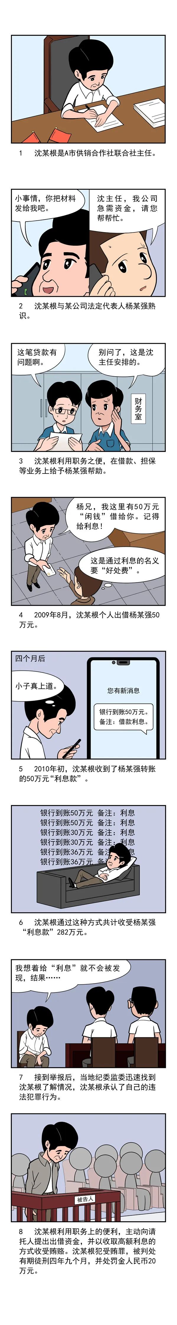 经查,沈某根在担任A市供销社党委书记、主任期间,通过“借贷收息”的方式共计收受杨某强“利息”款282万元,扣除杨某强同期从他人处借款的最高年利率18%,实际受贿数额为174万余元。2019年2月,A市纪委监委给予沈某根开除党籍、开除公职处分,将其涉嫌受贿犯罪问题移送检察机关依法审查起诉。