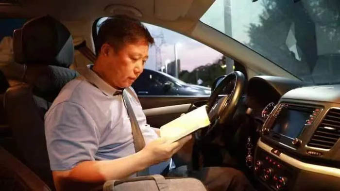 路福林到外地办案途中,在车上挤抽时间研究案情。