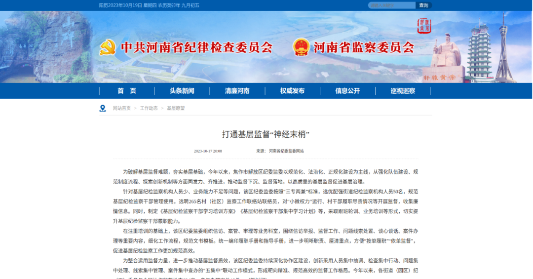 为破解基层监督难题,夯实基层基础,今年以来,焦作市解放区纪委监委以规范化、法治化、正规化建设为主线,从强化队伍建设、规范制度流程、探索创新机制等方面同发力、齐推进,推动监督下沉、监督落地,以高质量的基层监督促进基层治理。