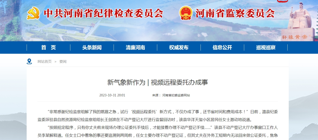 “非常感谢纪检监察组解了我的燃眉之急,试行‘视频远程委托’新方式,不仅办成了事,还节省时间和费用成本!”日前,温县纪委监委派驻县自然资源局纪检监察组组长王剑波在不动产登记大厅进行监督回访时,该县华洋天玺小区居民任女士激动地说道。