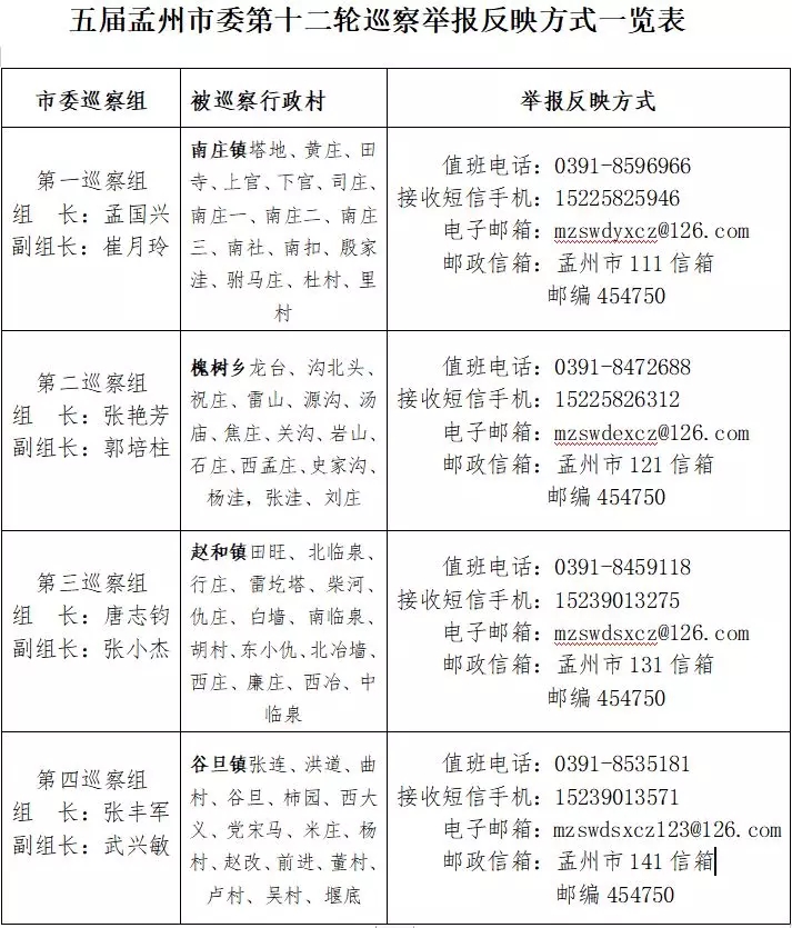 11月14日,市委4个巡察组分别进驻南庄镇、槐树乡、赵和镇、谷旦镇4个乡镇的60个行政村,自11月15日起,开展五届孟州市委第十二轮巡察工作。本轮巡察采取“大组+小组”“一托N”形式开展,集中巡察时间30天。
