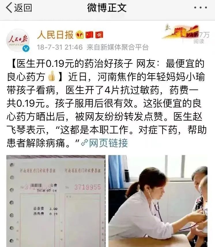 焦作市马村区人民医院赵飞琴开出“一毛九”药方治好孩子丘疹的事迹,被人民日报官方微博转发。