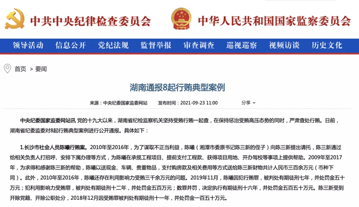 9月23日,湖南省纪委监委通报了8起行贿典型案例。
