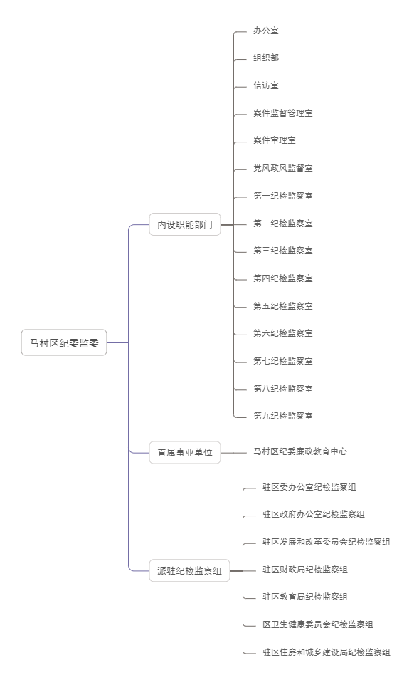 马村区纪委机关与马村区监委合署办公,共有15个内设机构,分别为:办公室、组织部、信访室、案件监督管理室、案件审理室、党风政风监督室、一至八纪检监察室纪检监察室。实行统一管理的派驻机构7个。