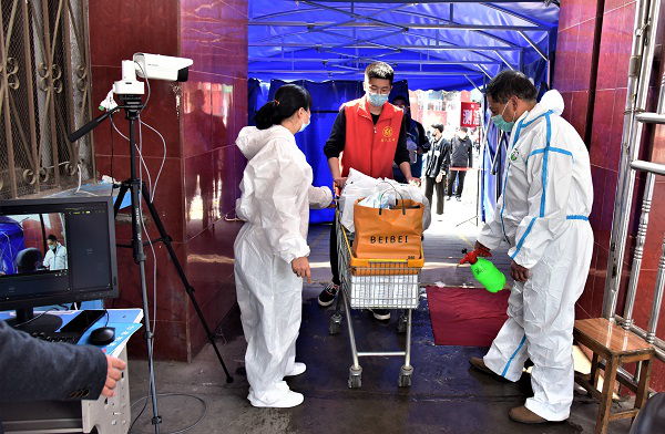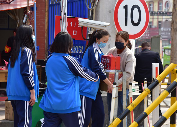 为减少外来人员进入校园,尉氏三中洧川校区组织学生志愿者帮助学生家长运送物品