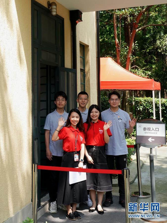 在复旦大学《共产党宣言》展示馆,一支名为“星火”的党员志愿服务队部分队员在馆前合影(2020年6月30日摄)。新华社记者 刘颖 摄