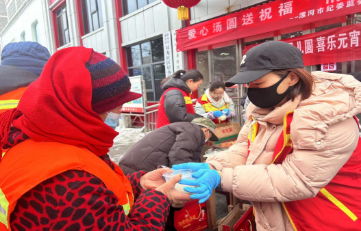 “送些汤圆给大家吃,你们不畏严寒、坚守岗位,辛苦了!”当日上午8时许,市纪委监委组织委机关部分志愿服务者,带着汤圆、包子、糖糕等食物,来到源汇区双龙社区开展了“爱心汤圆送祝福 情暖城市美容师”活动,向坚守在一线岗位的120余名环卫工送上了暖心汤圆和早餐。当一碗碗热气腾腾的汤圆、一份份爱意融融的年糕,从志愿者手中传递到环卫工手里时,辛勤工作的城市“美容师”们吃在嘴里暖在心里,连声道谢,整个现场顿时充满了温暖,每个环卫工脸上洋溢着笑容。