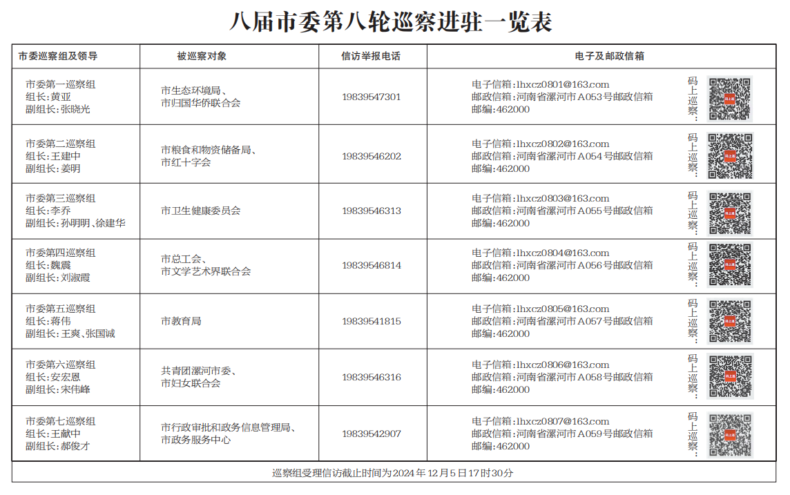 本次巡察时间40天左右。为便于干部群众反映情况,市委巡察组开通了信访电话,设置了征求意见箱、专用邮政信箱、信访二维码等。受理信访时间截止到2024年12月5日17时30分。巡察期间,市委巡察组将严格落实中央八项规定及其实施细则精神和市委相关规定,主动接受被巡察单位干部群众和社会各界监督。市纪委监委监督举报电话:12388。市委组织部监督举报电话:12380。(彭思齐)