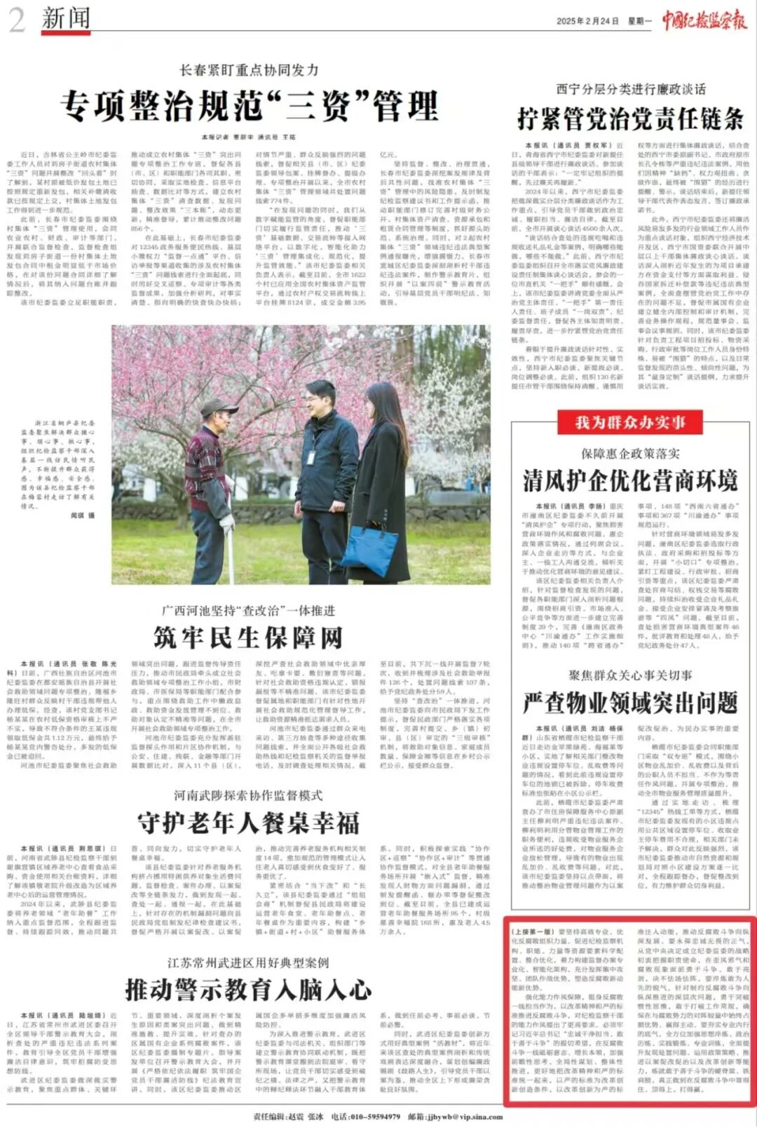 2月24日,中国纪检监察报头版刊发张巍同志署名文章《坚决清除腐败这个最大威胁》,围绕把改革精神和严的标准贯穿到反腐败工作全过程各方面,坚持严的标准,保持反腐败强大攻势,深化改革创新,提升反腐败工作质效,强化能力作风保障,挺身反腐败一线担当作为进行深刻论述。