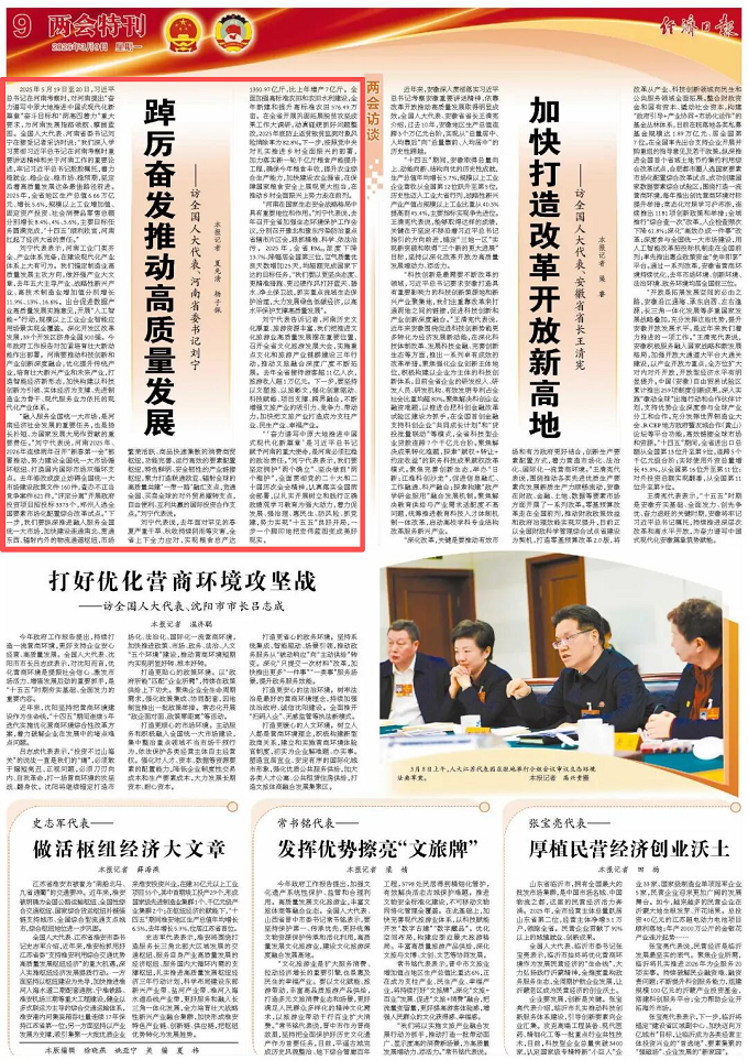“‘奋力谱写中原大地推进中国式现代化新篇章’是习近平总书记赋予河南的重大使命,是河南必须扛稳的政治责任。”刘宁代表表示,我们要坚定拥护“两个确立”、坚决做到“两个维护”,全面贯彻党的二十大和二十届历次全会精神,认真落实全国两会部署,以扎实开展树立和践行正确政绩观学习教育为强大动力,着力促发展、强治理、惠民生、防风险、抓党建,努力实现“十五五”良好开局,一步一个脚印地把宏伟蓝图变成美好现实。(夏先清 杨子佩)