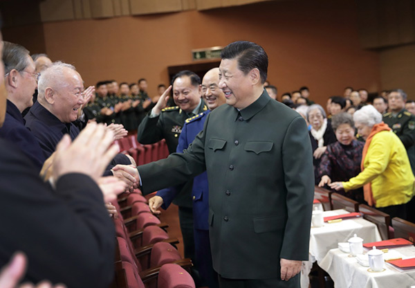 下午3时30分许,习近平来到老同志中间,全场响起热烈掌声。习近平同大家亲切握手,关切询问他们的身体和生活情况,共同回顾在党的十九大精神指引下,过去一年来党、国家和军队事业展现的新气象、开创的新局面、取得的新成就。老同志们一致表示要更加紧密地团结在以习近平同志为核心的党中央周围,坚持以习近平新时代中国特色社会主义思想为指导,深入贯彻习近平强军思想,深入贯彻新时代军事战略方针,锐意进取,埋头苦干,以优异成绩迎接新中国成立70周年。