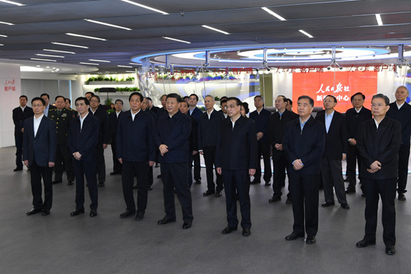 1月25日,中共中央政治局在人民日报社就全媒体时代和媒体融合发展举行第十二次集体学习。这是习近平、李克强、栗战书、汪洋、王沪宁、赵乐际、韩正等在人民日报新媒体中心听取报社微博、微信公众号、客户端建设情况汇报,并观看新媒体产品展示。(新华社记者 饶爱民 摄)