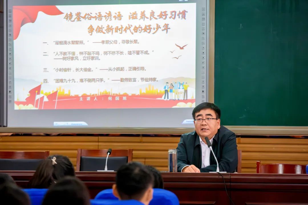面对八年级的中学生,“何老师”结合自己的学习成长和工作经历,用一个个风趣真实的故事为学生们生动形象的阐释了“屋檐滴水辈辈照”“人不教不懂,钟不敲不鸣,树不修不长,娃不管不成”“小时偷针,长大偷金”“困难九十九,难不倒两只手”等谚语的深刻含义。