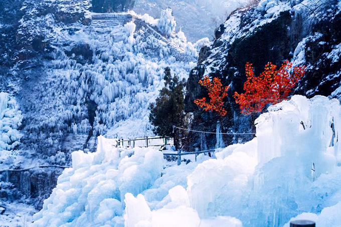 一场纷纷扬扬的大雪过后,灵宝市娘娘山风景区银装素裹,冰瀑如银河倾泻,冰挂似琼枝玉树,橙黄的枫叶如跳动的火焰,整个娘娘山宛如童话世界。(灵宝市纪委监委 许晓珂 摄)