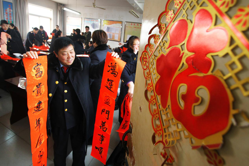 【年关将至 游子归来】洛阳铁路文化部门在每年的新春到来之际都要组织书法名家深入生产一线为广大职工、过往旅客写春联送祝福。瞧,在洛阳客运段,刚刚退乘的列车员拎起春联,满怀欣喜(瀍河区纪委监察委 图/郭庆)