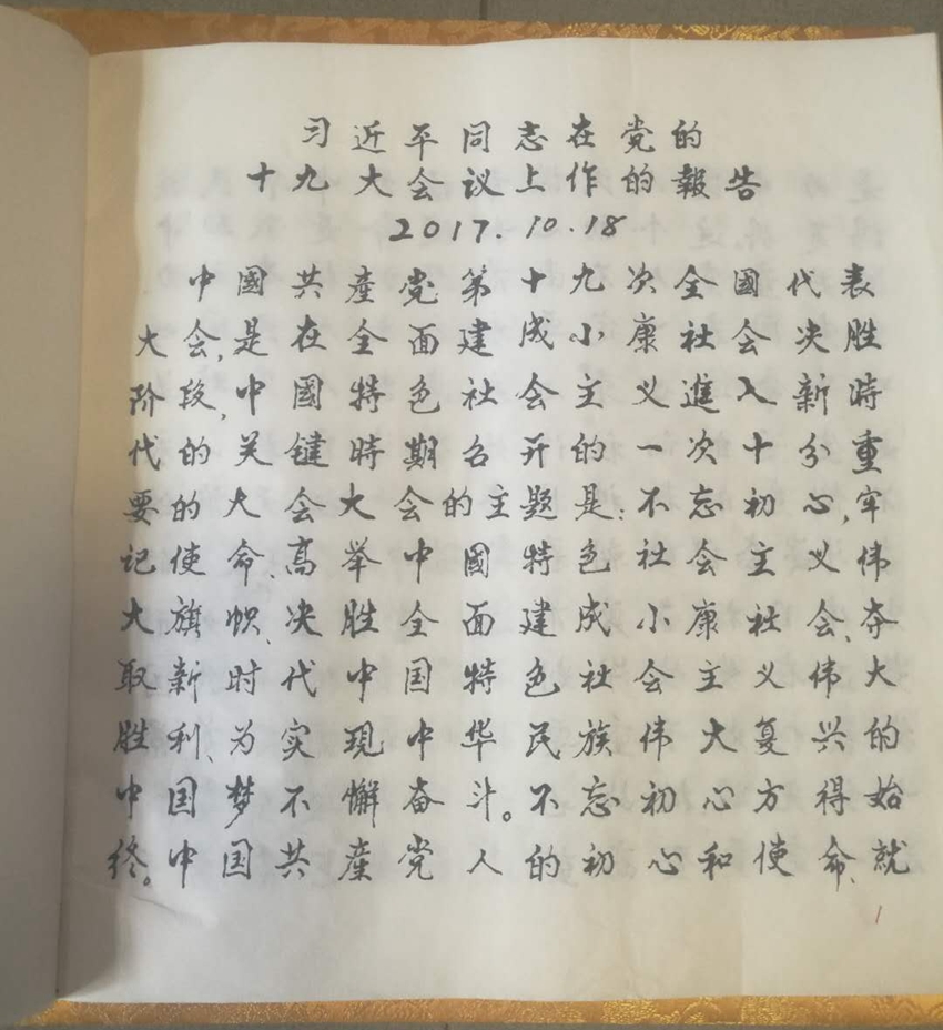 学习宣传贯彻好党的十九大精神,是每一名党员干部的责任和使命。老纪检干部翟宗州表示,自己从一名农民子弟成长为国家干部,全是组织上培养的结果,自己的老上级、老领导身上艰苦朴素、求真务实的工作作风也深深地影响着自己,自己作为一名党员首先要学懂弄通。怎么学?他心中有了抄写党的十九大报告的想法。