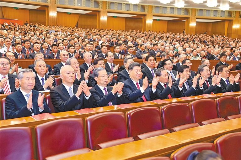人民大会堂万人大礼堂华灯璀璨、气氛喜庆。19时55分,在欢快的乐曲声中,习近平等领导同志步入大礼堂,同少数民族代表、老同志代表亲切握手,全场响起热烈的掌声。