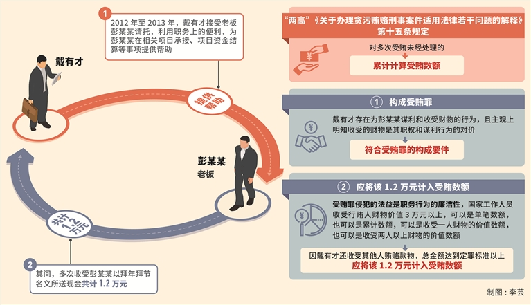 相关证据证实,2012年至2013年,戴有才接受老板彭某某请托,利用职务上的便利,为彭某某在相关项目承接、项目资金结算等事项上提供帮助,并多次收受彭某某以拜年拜节名义所送现金共计1.2万元。第一,戴有才存在为彭某某谋利和收受财物的行为,且主观明知收受的财物是其职权和谋利行为的对价,符合受贿罪的构成要件。第二,受贿罪侵犯的法益是职务行为的廉洁性,受贿数额是受贿犯罪社会危害程度的重要判断因素,故收受财物的行为是否构成受贿罪,关键在于收受了多少财物,而不在于收受了多少人的财物。国家工作人员收受行贿人财物价值3万元以上,可以是单笔数额,也可以是累计数额,可以是收受一人财物的价值数额,也可以是收受两人以上财物的价值数额。因戴有才还收受其他人贿赂款物,总金额达到定罪标准以上,因此应将该1.2万元计入受贿数额。