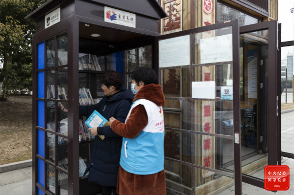 为推动学雷锋志愿服务活动制度化常态化,在江苏省高邮市文明办的指导推动下,全市积极创新探索志愿服务形式,形成了党员志愿者慰问老兵、助学、助残、助老、重大活动保障等多种模式,引领志愿服务的深度、宽度不断拓展,助推雷锋精神发扬光大。图为净土寺广场的志愿者在漂流书屋为读者提供借书、还书服务。(江苏省高邮市纪委监委 欧阳书兰 摄)