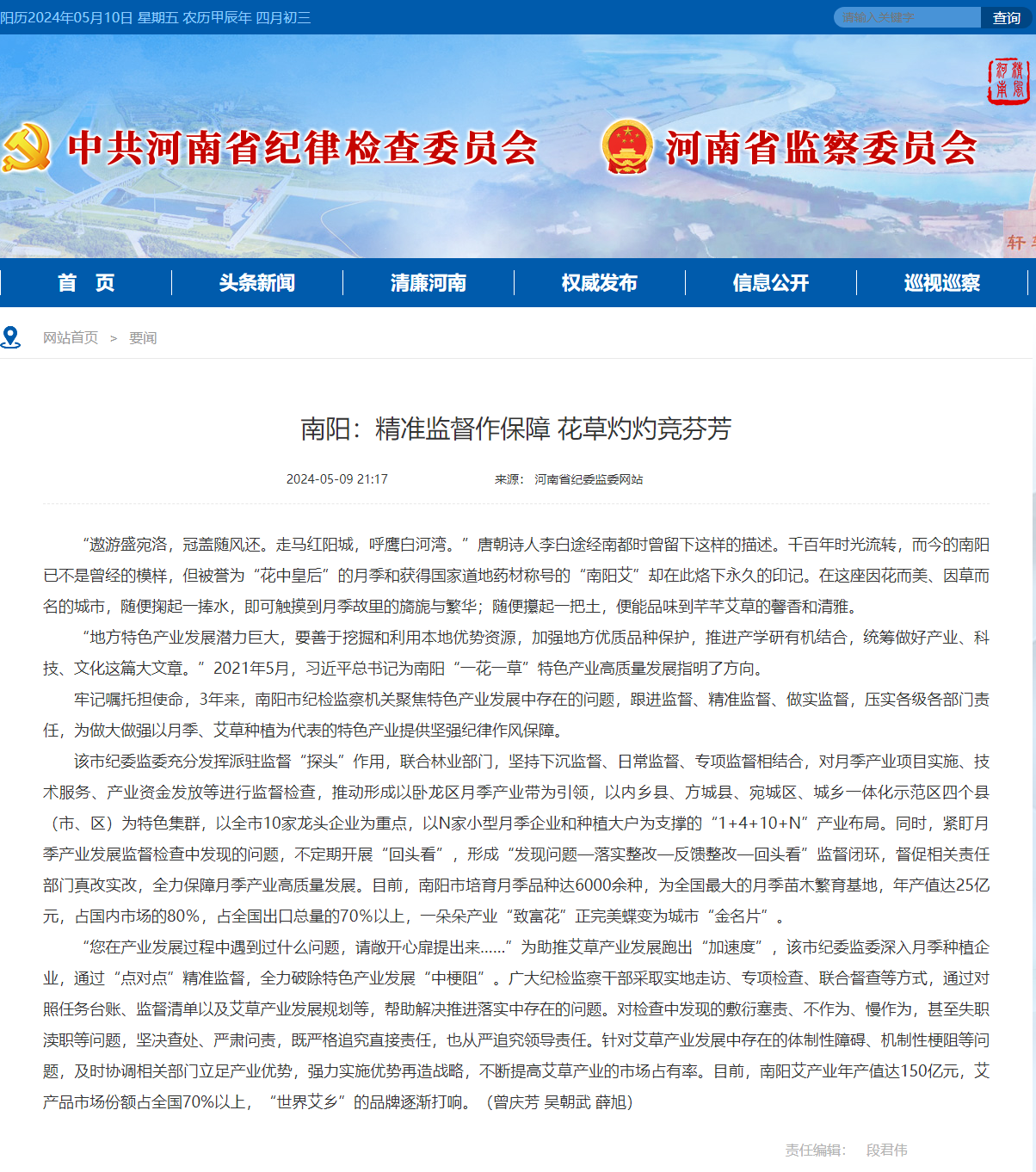 牢记嘱托担使命,3年来,南阳市纪检监察机关聚焦特色产业发展中存在的问题,跟进监督、精准监督、做实监督,压实各级各部门责任,为做大做强以月季、艾草种植为代表的特色产业提供坚强纪律作风保障。