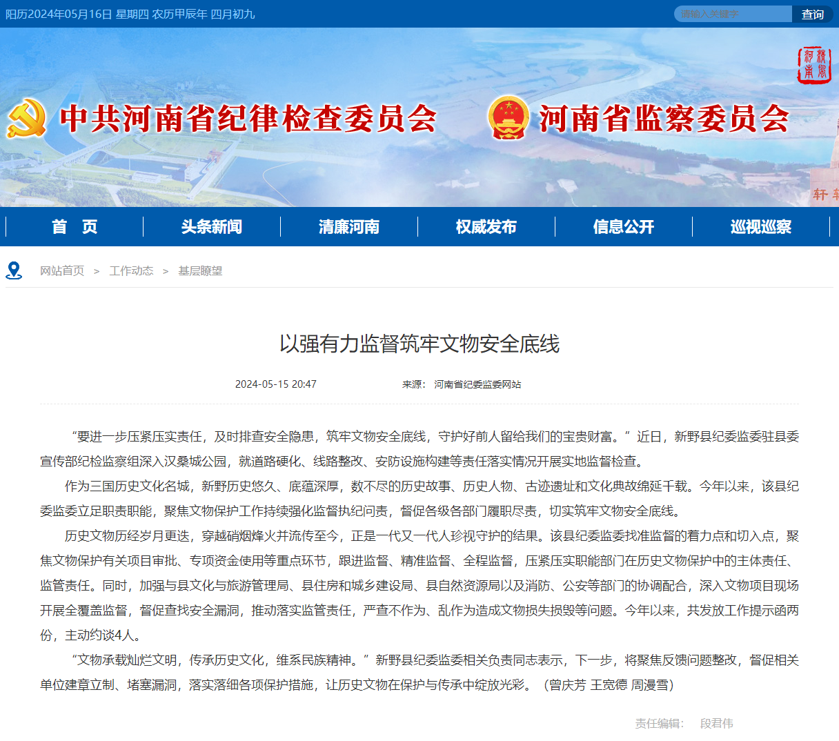 作为三国历史文化名城,新野历史悠久、底蕴深厚,数不尽的历史故事、历史人物、古迹遗址和文化典故绵延千载。今年以来,该县纪委监委立足职责职能,聚焦文物保护工作持续强化监督执纪问责,督促各级各部门履职尽责,切实筑牢文物安全底线。
