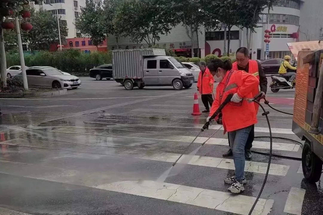 5月10日凌晨5时,仲景大道与范蠡路东南角已是一派热闹景象:区环卫站50余人分工协作,火碱去油、刷子去污、高压冲洗,消除路面隐患、增设垃圾收集容器。