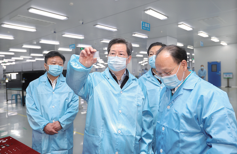 11月1日,省委书记楼阳生(左二)到南阳市中光学集团股份有限公司调研数字光产业发展情况。河南日报记者 董亮 蔡迅翔 摄