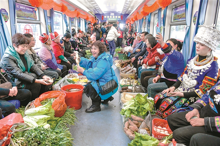慢火车自身也在变化。一些车次在运营中注入特色文化元素,带来更细腻、富有回味的体验。临近年节,在甘肃,舞狮和曲子戏引得乘客纷纷举起手机;在贵州,红窗花和吉祥结的映衬下,民族乐舞将浓浓的年味弥漫在车厢。此外,列车逐步升级的乘坐服务、沿途变换的风光景致,帮人们扫除不少奔波的劳累和急切,平添了些漫游的惬意和享受,为慢火车在功能性之外融入了诗意。在一段短暂的流动的时间里,安坐在暖意融融的车厢中,没有了窗外的寒意,各方旅客一起重温乡情、畅享欢乐。