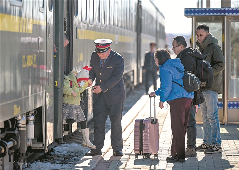 春运期间,运行在内蒙古草原深处的6856/7次列车全程491公里,票价53元,沿途经停28个车站,被广大农牧民亲切称为草原“慢火车”。图为近日,在白音察干站,乘务员穆杰帮助小乘客下车。 新华社记者 连振 摄
