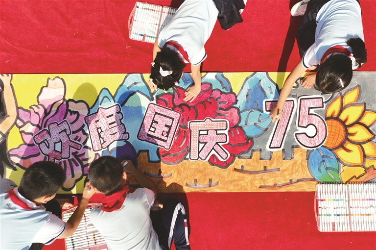 国庆节临近,各地举办丰富多彩的活动迎接新中国75周年华诞。图为9月28日,在山东青岛重庆路第三小学,孩子们共绘迎佳节彩色画卷。新华社发(王海滨 摄)