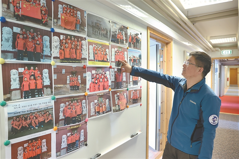 中国首个北极科考站——黄河站建站20年来,一代代科技工作者接力守望,推动我国极地科考事业发展。截至2023年底,黄河站已累计支持250多个业务和科研项目,接纳660多位科考人员进行科学考察。图为近日,在挪威新奥勒松,科考队员胡正毅在黄河站介绍历次科考活动队员合影。 新华社记者 赵丁喆 摄