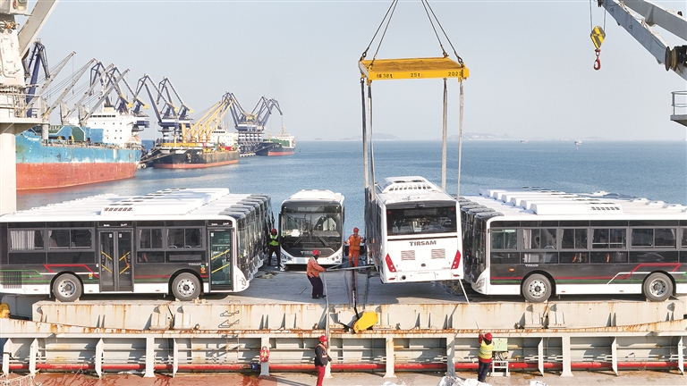 图为近日,出口非洲国家的公交车在山东港口烟台港装船。图片来源:视觉中国