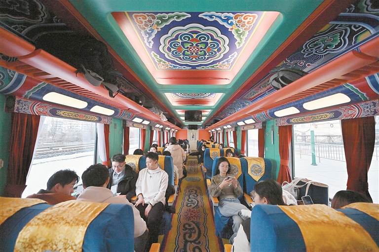 近日,从吉林省龙井市开往长白山的“龙井号”民俗旅游专列鸣笛启程,开启冬日乐赏冰雪之旅。该专列融合“冰雪+民俗”双重主题,每节车厢各成一道风景,绚丽多彩的民俗风情贯穿全程。车窗外,壮美的林海雪原不断掠过,吸引游客观赏。 图片来源:视觉中国
