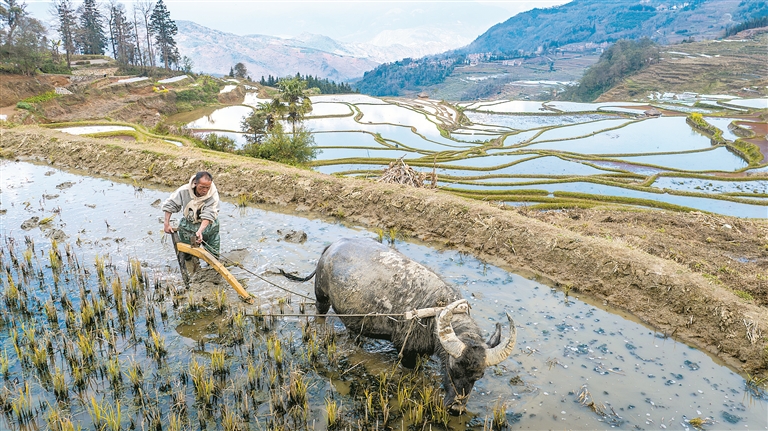 图为云南省元阳县阿者科村村民在驱牛犁田。新华社记者 胡超 摄