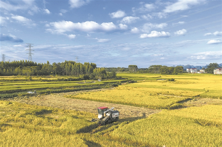 金秋时节,广西壮族自治区桂林市临桂区四塘镇大湾村晚稻成熟,田野里稻穗低垂、金黄遍野,农机手驾驶收割机穿梭其中,抢收稻谷。夏立慧 摄